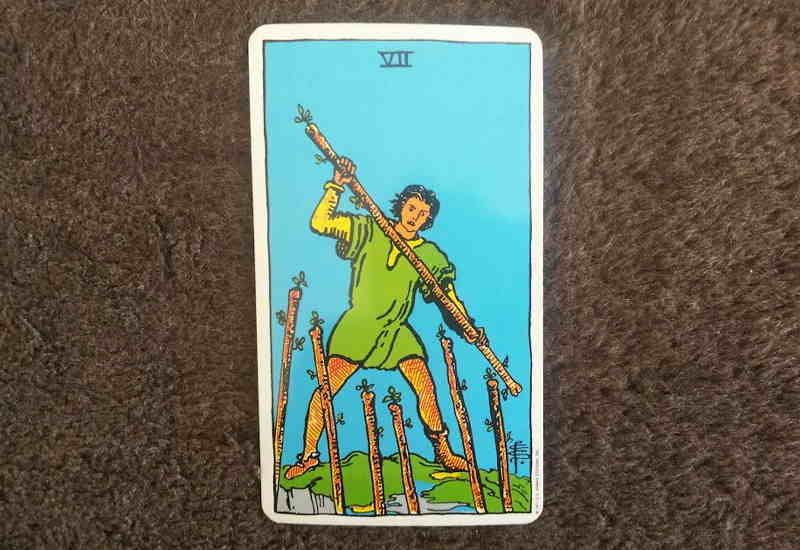 タロット占いの詳しい解釈と意味 小アルカナ『ワンドの7(Ⅶ)』 タロット占い 下から突き出た6本のワンドを前に1本のワンドで立ち向かう人物が描かれたライダーウェイト版小アルカナ『ワンドの7(Ⅶ)』には、どんな意味が隠されているのでしょうか。 タロットカードの『ワンドの7(Ⅶ)』を詳しく読み解いていきます。 タロットカード『ワンドの7(Ⅶ)』説明と解釈 背景には、とても広い青空が広がっています。 緑の草が生え、水たまりがある崖のような高台には、険しい表情の男性が1人います。 彼は、黄色のシャツに緑のチュニックを重ね着し、黄色のタイツ、左足にブーツ、右足にはひも靴という格好です。6本のワンドに対抗するには身軽すぎる服装と普通では考えられない足元から、追い詰められて切迫していることがうかがわれます。 唯一の武器である1本のワンドを両手でしっかりと握り、下側から攻めてくる敵と孤軍奮闘していますが、高台0にいることが有利に働いているようです。 勇敢な彼は、人生の浮き沈みを経験する中、必死に耐え、欲しいものを掴み取ってきました。それらは彼にとってかけがえのないものとなり、いまや魂の一部となっています。 更なる高みを目指すため、力強く立ち上がり、再び奮闘しています。 『ワンドの7(Ⅶ)』正位置が出たときの意味 ・プレッシャーに耐えます。 ・攻撃的になります。 ・自分の立場を守ります。 ・批判と戦います。 ・自分が信じるもののために立ち上がります。 ・自分が正しいことを確信します。 ・しっかりと足場を固めます。 ・主導権を握ります。 ・信念を貫きます。 【その他のキーワード】 ・攻撃・抵抗・信念・奮闘・対決・自己主張・対立・交渉・勇気・自信 『ワンドの7(Ⅶ)』正位置の具体的なリーディング例 危機的状況の中、信念を持って立ち上がり、勇気を出して闘います。 困難な状態に陥り、矢面に立たされますが、有利な状況です。 トラブルに見舞われても、順風満帆なような前向きな精神状態でいられます。 ~人間関係全般~ 積極的で自己主張をはっきりする強気な人たちと縁があります。 パートナー(恋人や夫)がいる場合…自信を持って、はっきりと自己主張をします。 パートナーがいない(募集中の)場合…モチベーションが高まり、出会いのチャンスに力を注ぎます。 こころに思う(片思いの)人がいる場合…気持ちが高まります。失恋も覚悟の上、当たって砕けろの精神で激しいアプローチをしそうです。 仕事面…駆け引きや商談が有利に進みます。 健康面…健康問題が出てきそうですが、努力することで改善の兆しが見えそうです。 経済面…出費はかさみますが、収入増に期待できます。 『ワンドの7(Ⅶ)』正位置対策や解決策(アドバイス) 起きた問題の主導権を握ってもうまく活かせないのは、有利な状況を過信しすぎているせいかもしれません。 自分を信じることも大切ですが、頭を冷やしてください。 有利な立場を利用して周囲を味方につけるなど1つずつ取り組んでいけば、解決の糸口が見えてきます。 『ワンドの7(Ⅶ)』逆位置が出たときの意味 ・困難は回避できそうです。 ・衝突は避けられます。 ・比較的、平和な対立です。 ・勇気がでません。 ・自信がありません。 【その他のキーワード】 ・不安・葛藤・弱気・当惑・心配症 『ワンドの7(Ⅶ)』逆位置の具体的なリーディング例 難しい状況ですが、心配しているようなことは起こらなくてすみそうです。 弱気になって思い悩み、結局思い切ったことができません。 もし衝突してしまうと圧倒的に不利な状況で苦戦を強いられます。 ~人間関係全般~ 消極的で流されます。表面上だけの関係になります。 パートナー(恋人や夫)がいる場合…危うい関係性になります。 パートナーがいない(募集中の)場合…パートナー探しを頑張っても無駄に終わります。 こころに思う(片思いの)人がいる場合…自信がなくなり、ライバルに負けそうです。 仕事面…無理や無駄な仕事が多くなりそうです。 健康面…身体はともかく精神的に弱くなります。 経済面…弱みにつけこまれます。 『ワンドの7(Ⅶ)』逆位置対策や解決策(アドバイス) 妨害や横やりに注意は必要ですが、はじめから無理と決めつけて諦めたら、そこで終わってしまいます。苦戦を覚悟しながらも前向きになってください。ことを無難に終わらせるために、無駄に悩んだり無駄に闘うのはやめましょう。 タロットカード『ワンドの7(Ⅶ)』意味まとめ カードに描かれている人物は、戦闘の真っただ中にいて攻撃しながら防御もしています。 力強い行動は、良くも悪くもエネルギーの流れを変化させるものです。 人間社会では、勝利が決まる戦いも困難との闘いもトラブルの原因になります。 闘いに意味があるのなら、勇敢さと積極性で闘い抜いてください。しかし、そうでないなら闘いから身を引く勇気が必要です。 攻撃するのか?、防御するのか?、流れに任せてただ流されていくのか?、自分の力で変えていくのか?を